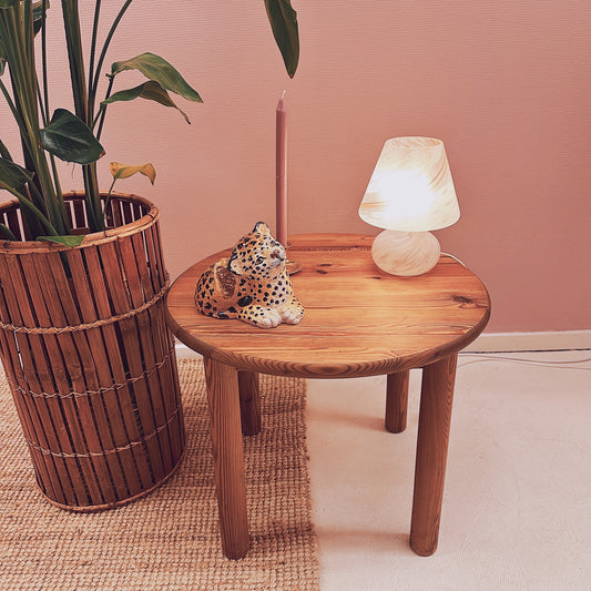 Sold outRound pine wood side table