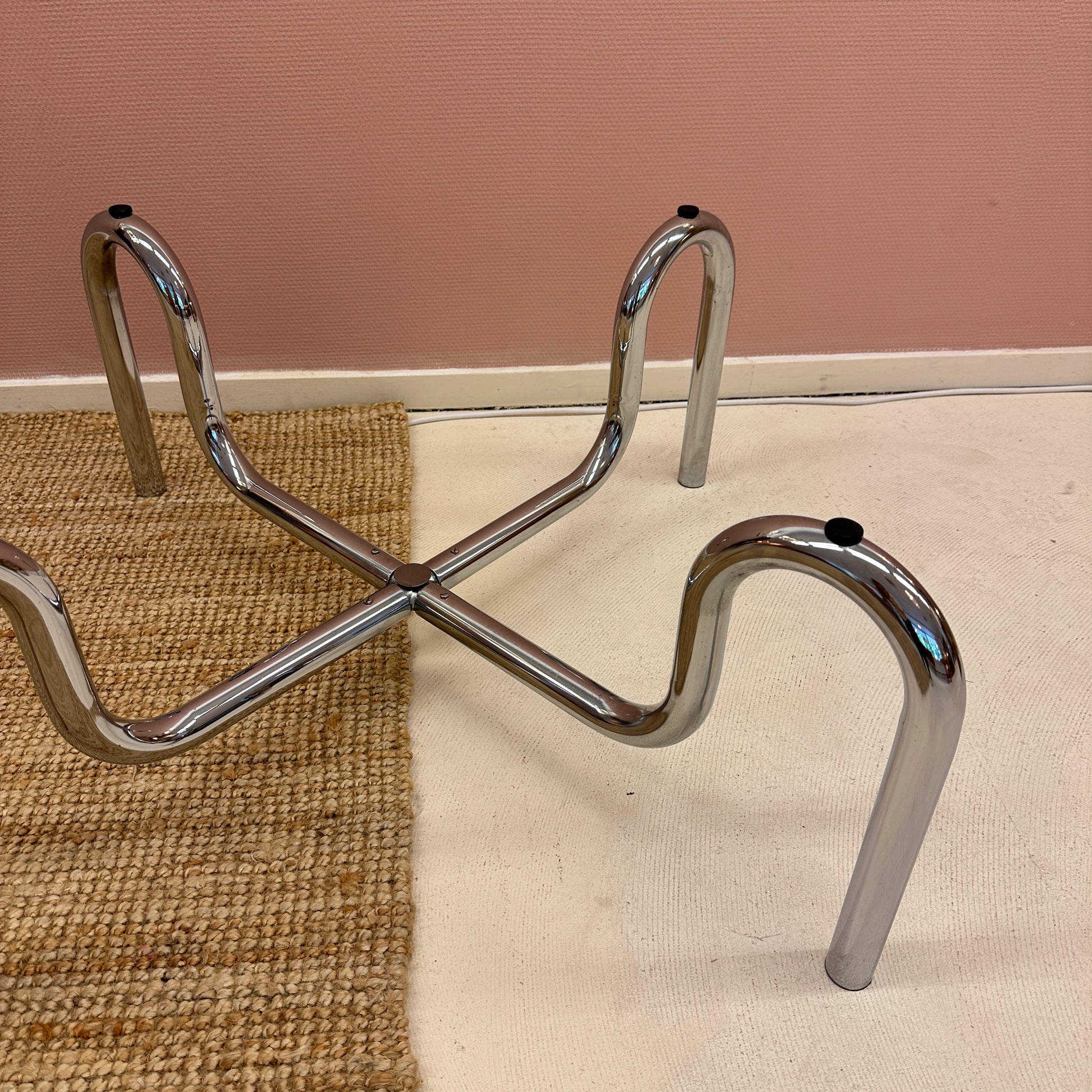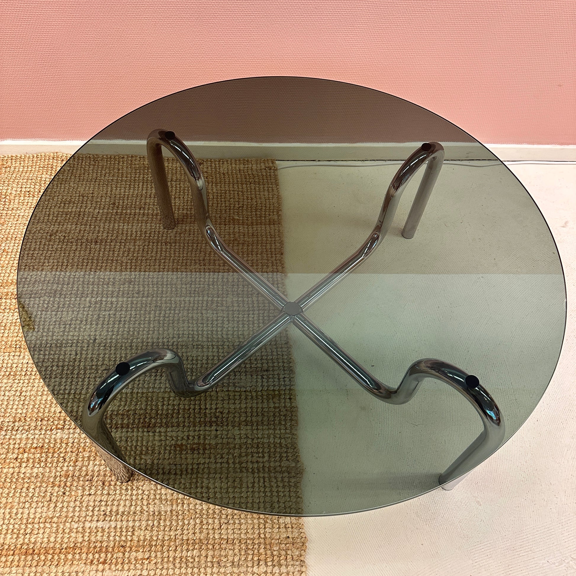 Gorgeous! This round coffee table with its spectacular tubular legs immediately caught our eye. The curves and the round smoked glass top are the perfect combination of vintage Space Age style and a modern look. The glass is in very good condition: no chips, just a few surface scratches and one more visible spot (see picture). Of course, the top can be flipped over so it won’t be visible anymore. Ideal as a statement piece in a mid-century modern or eclectic interior.