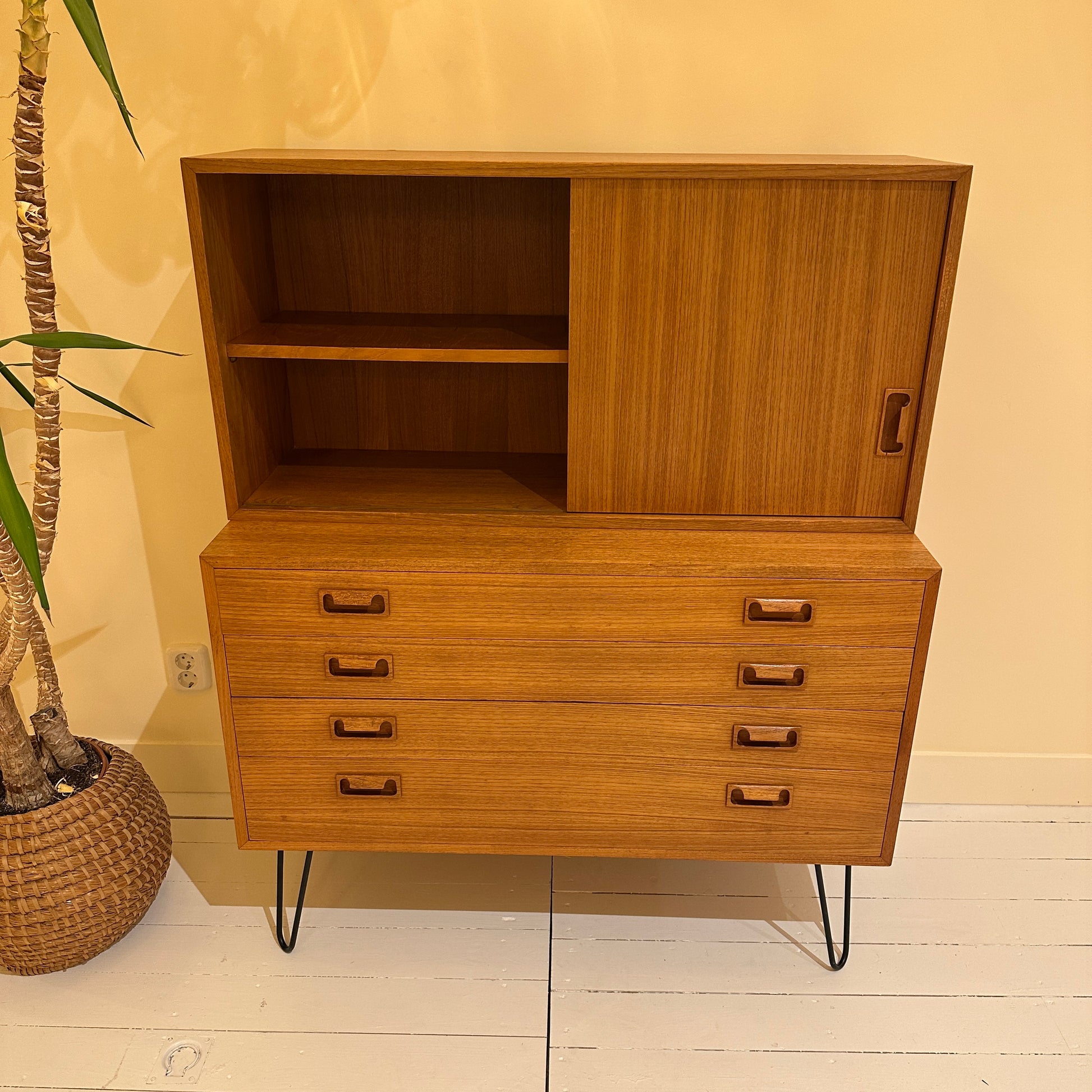 The German cabinet features several drawers, open shelving and a sliding door, making it practical as a bookcase or storage piece. The open shelves leave some room for display your favorite items. We especially love the recessed wooden handles, which give the piece such a clean and refined look. The top and bottom sections are separate elements.