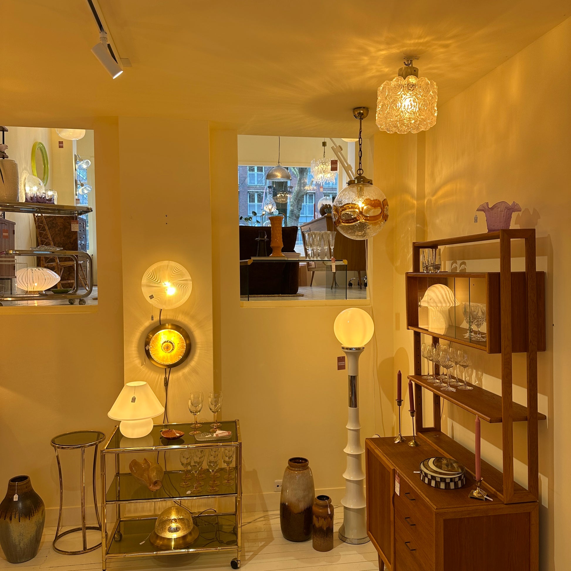 This flush mount light is made by Glashütte Limburg (Germany). With its heavy glass, it gives a very warm glow and a timeless feel. We love the chrome fixture mixed with the round and oval shapes on the side. This gives it a mid-century look, matching any type of interior style. Attributed to Helena Tynell, 1960's.