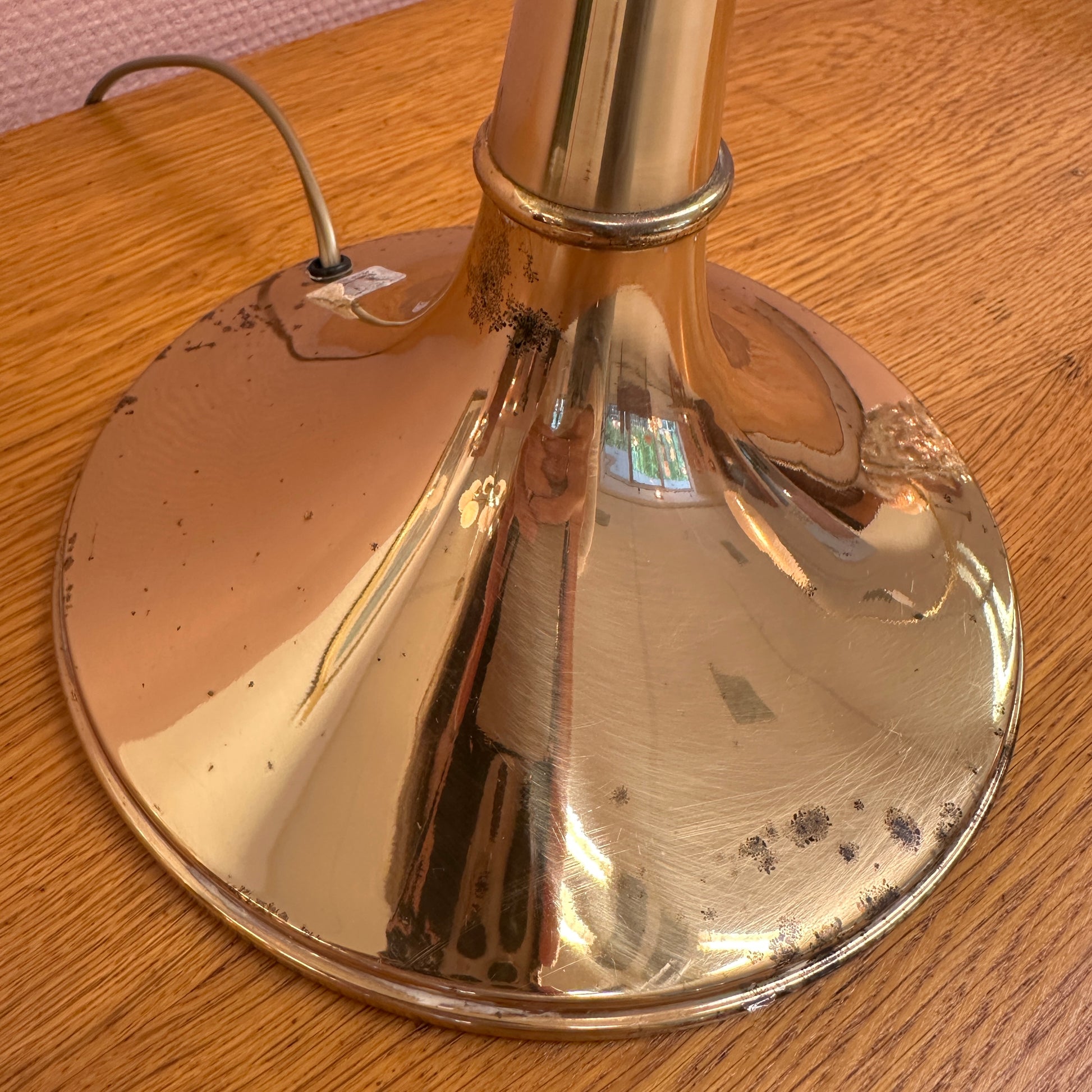 The brass has a nice patina, giving it that vintage look we like. The lampshade is second-hand and not original, but we think it suits the lamp perfectly. The warm coral /orange striped fabric gives off a soft, cosy light. The lamp has been tested and works as it should.