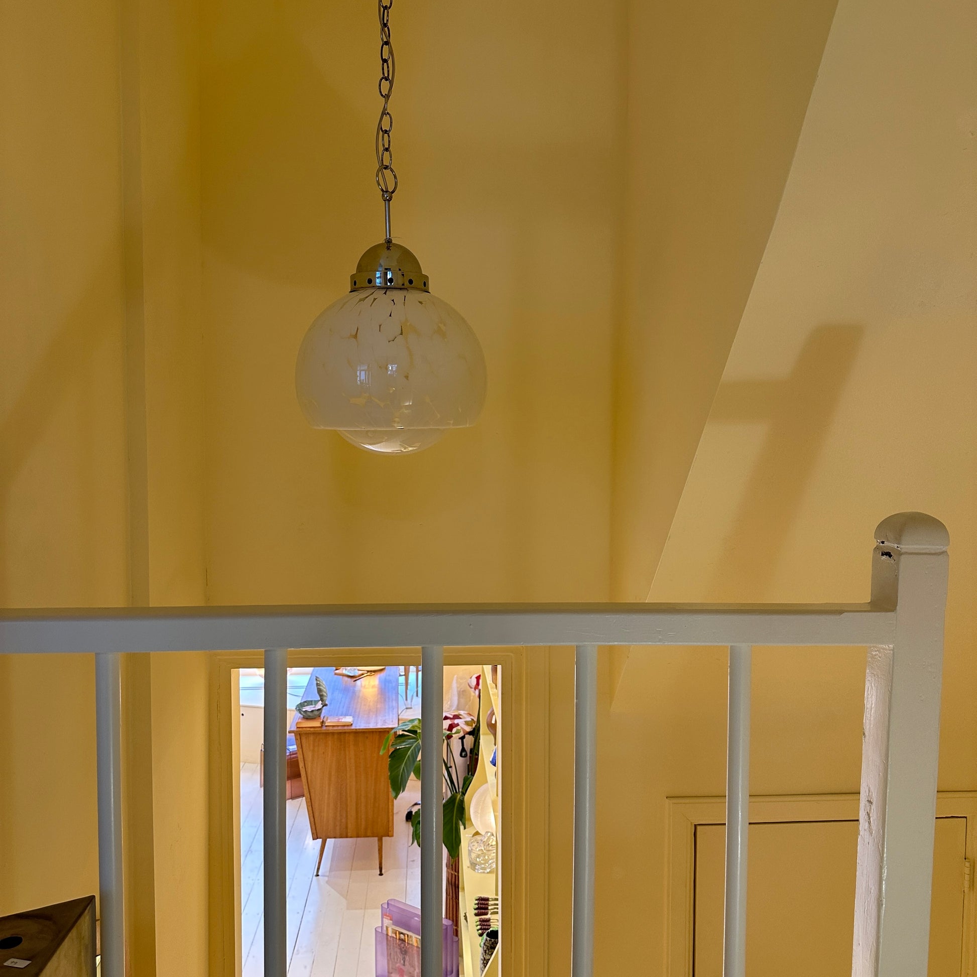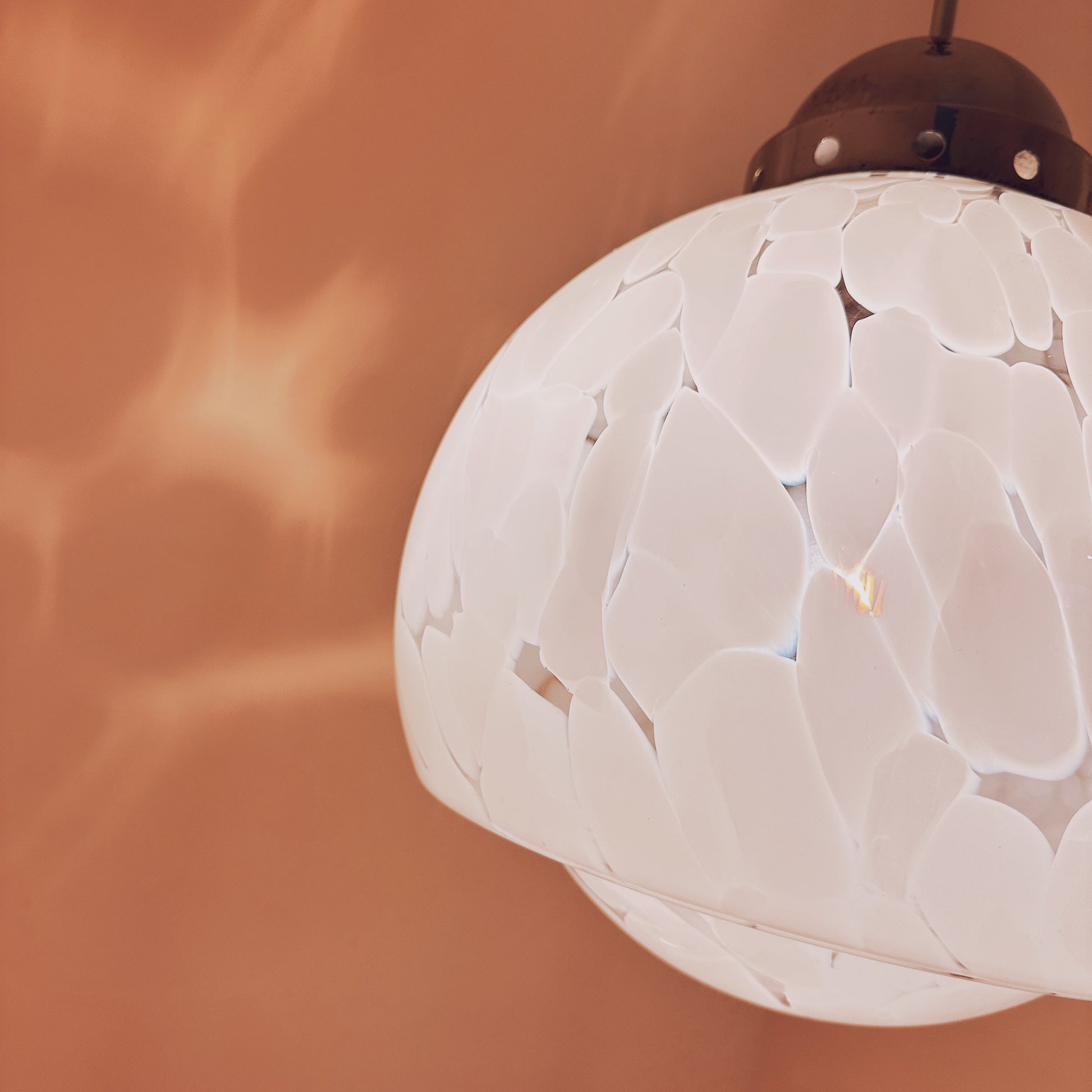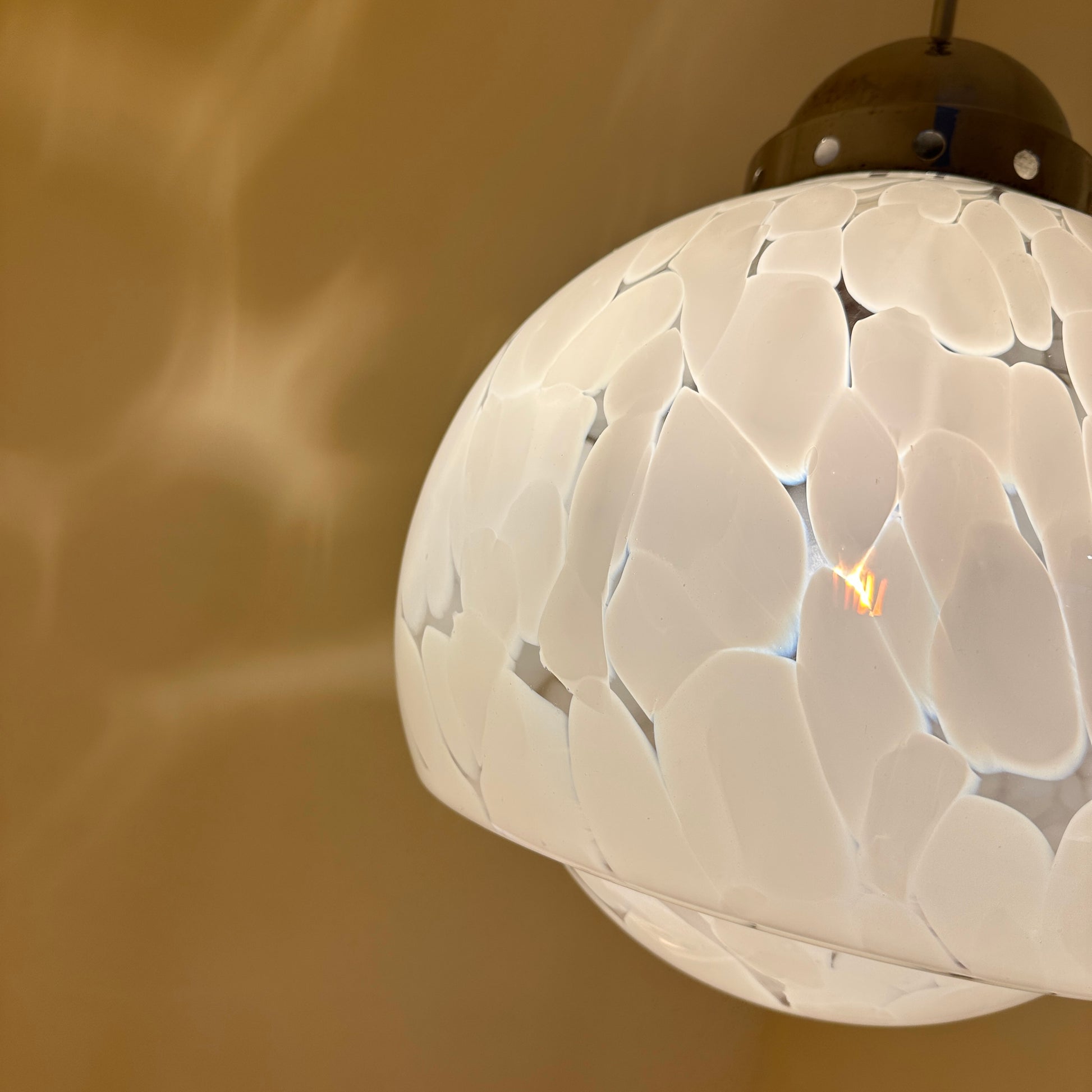 Italian pendant lamp by Carlo Nason, dating from the 1970s. We love the mushroom shape of this lamp and the white flecks in the transparent glass. When lit, they create beautiful, soft shadows on the walls, giving the lamp a very warm and atmospheric feel.