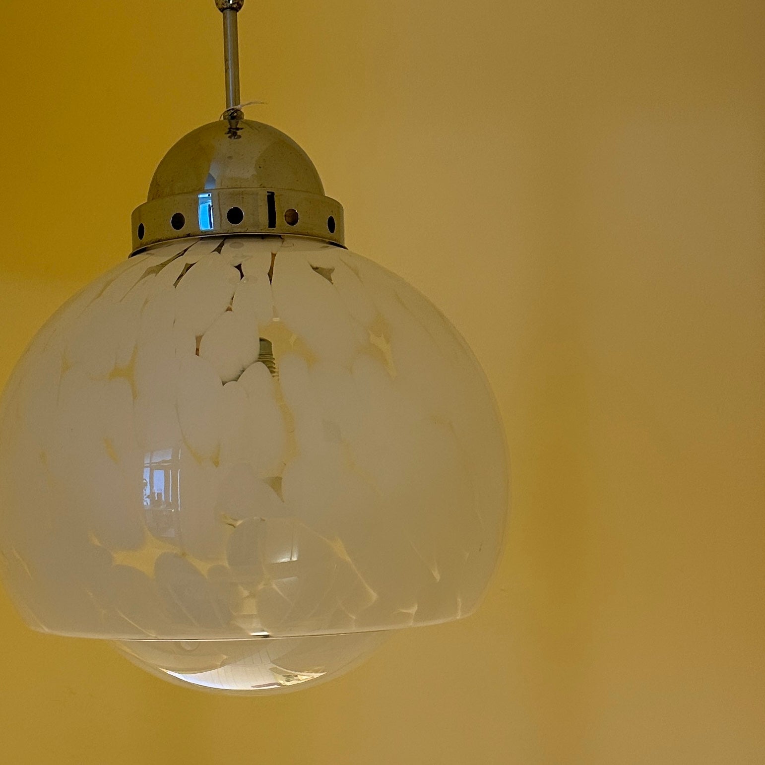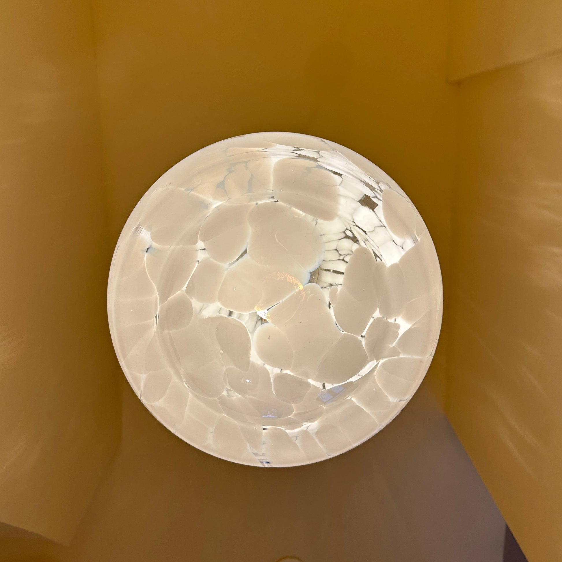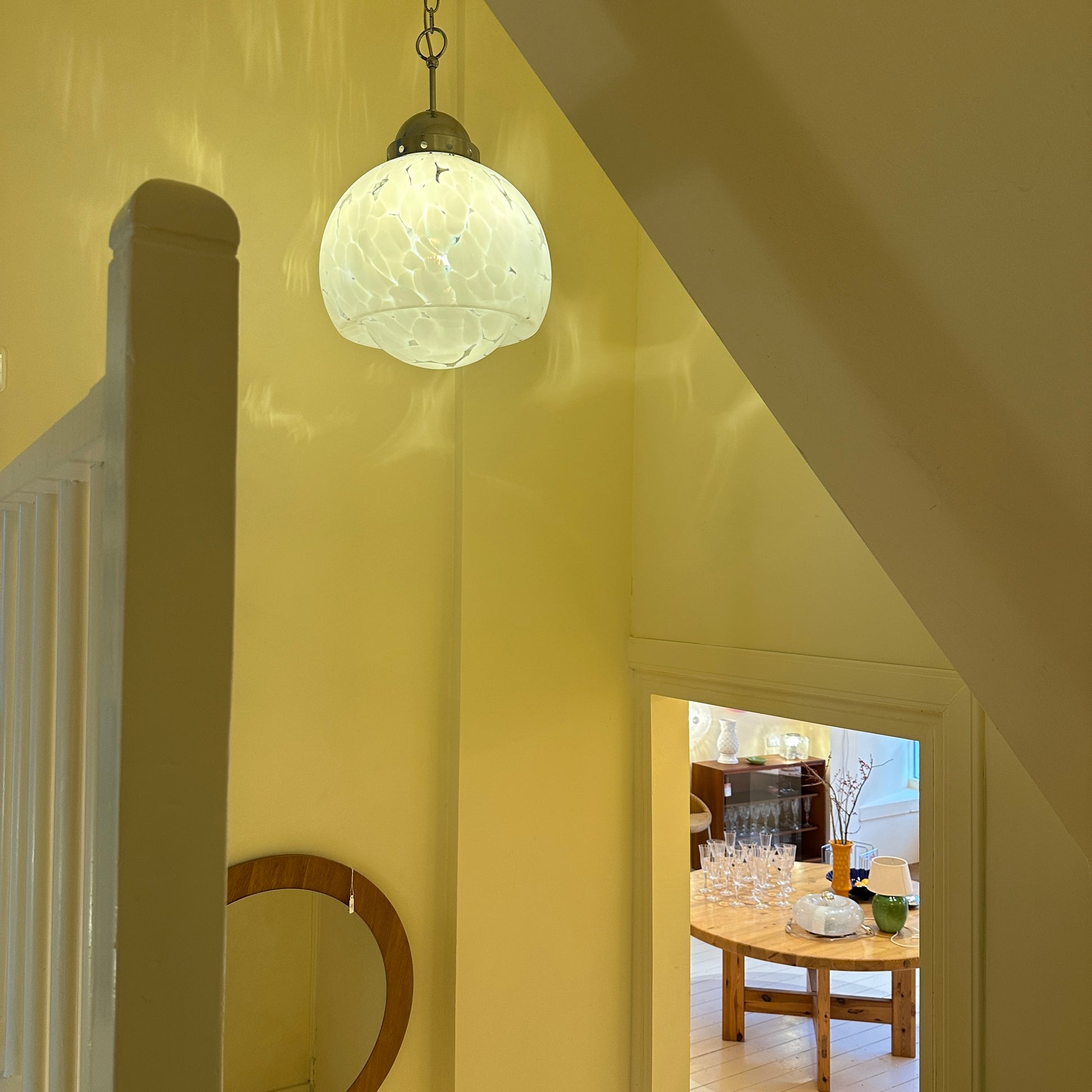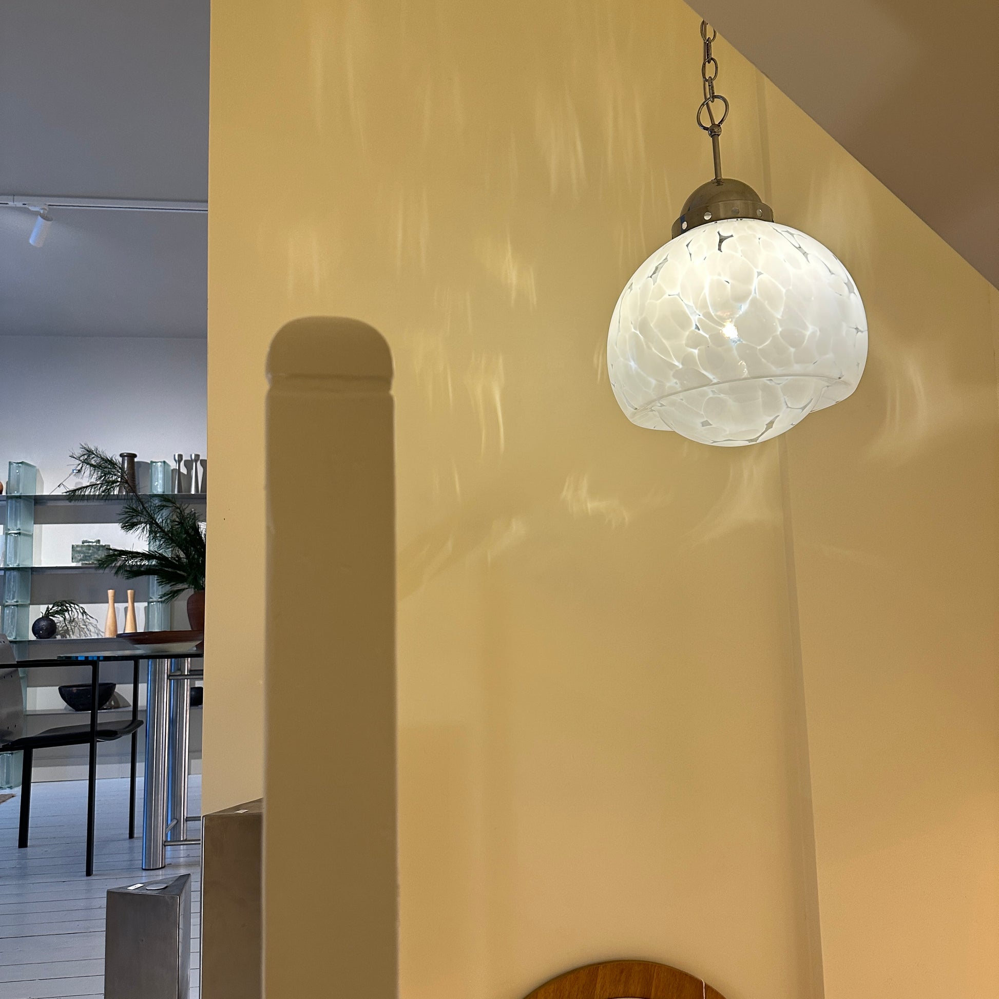 Italian pendant lamp by Carlo Nason, dating from the 1970s. We love the mushroom shape of this lamp and the white flecks in the transparent glass. When lit, they create beautiful, soft shadows on the walls, giving the lamp a very warm and atmospheric feel.