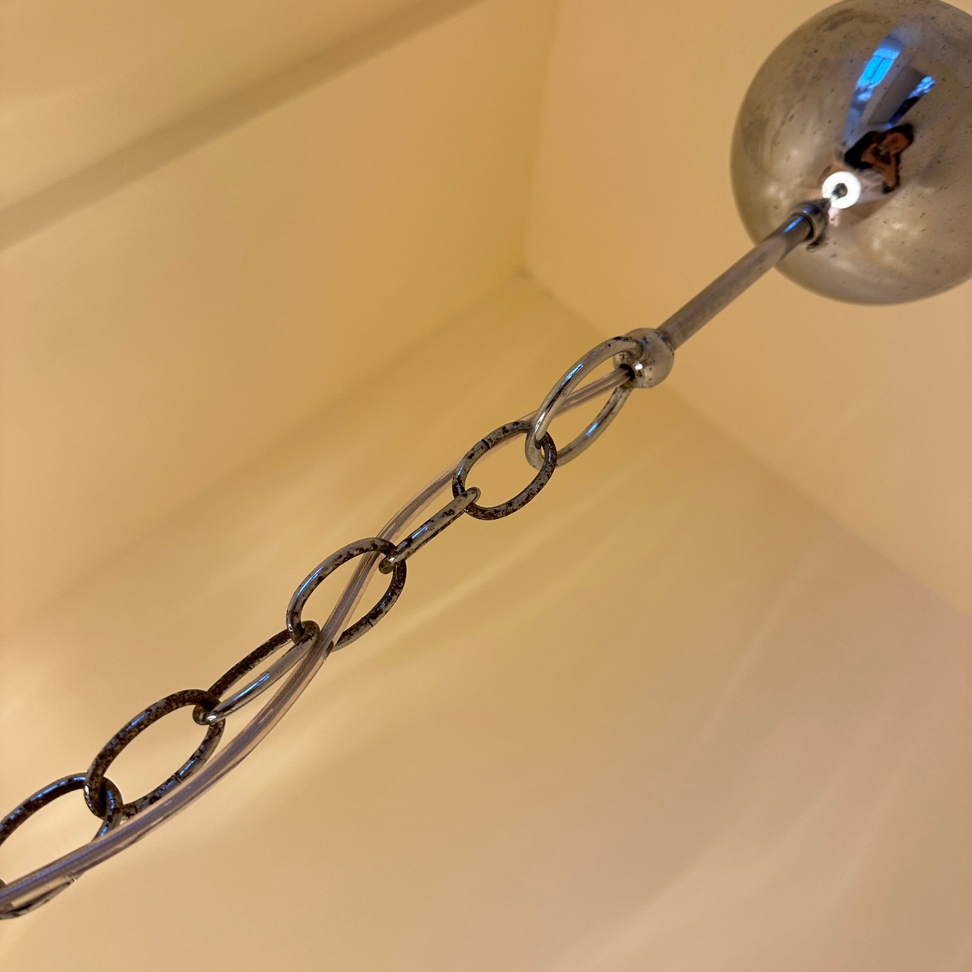 A timless Italian design with a chrome fixture that works beautifully above a dining table, in a hallway or as a statement piece. In very good vintage condition with some patina on the chain