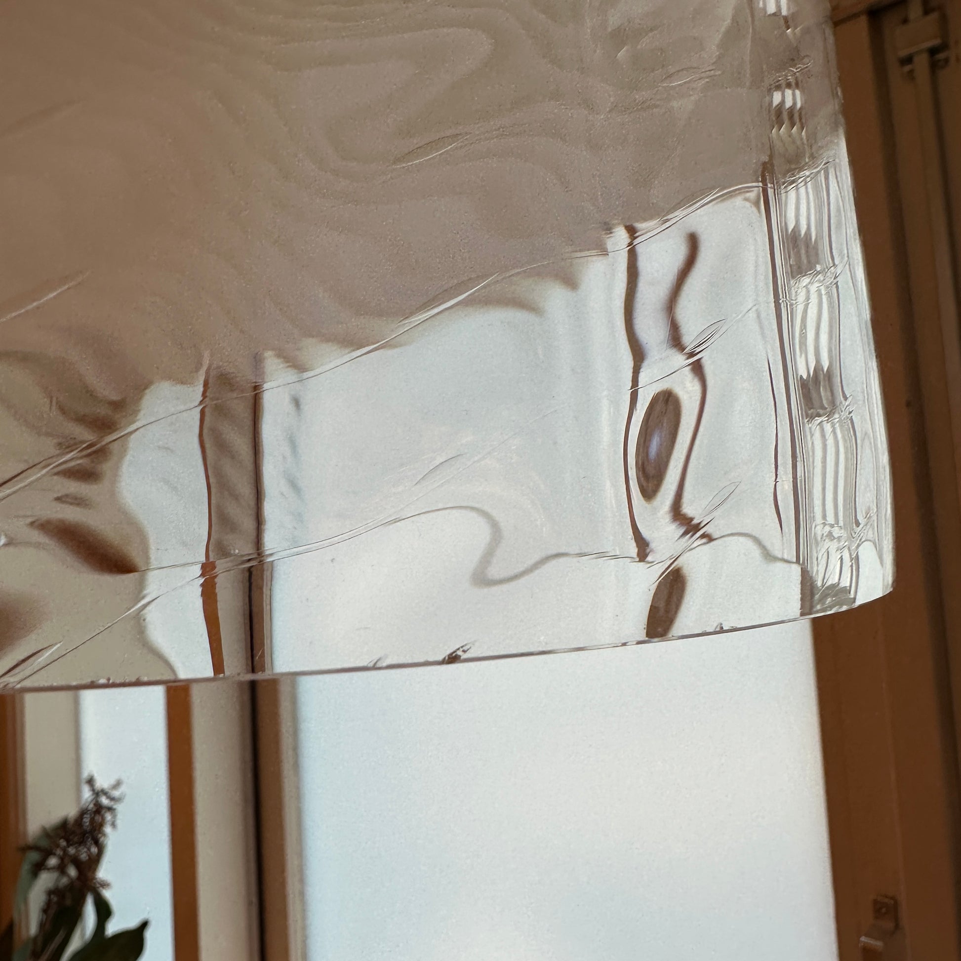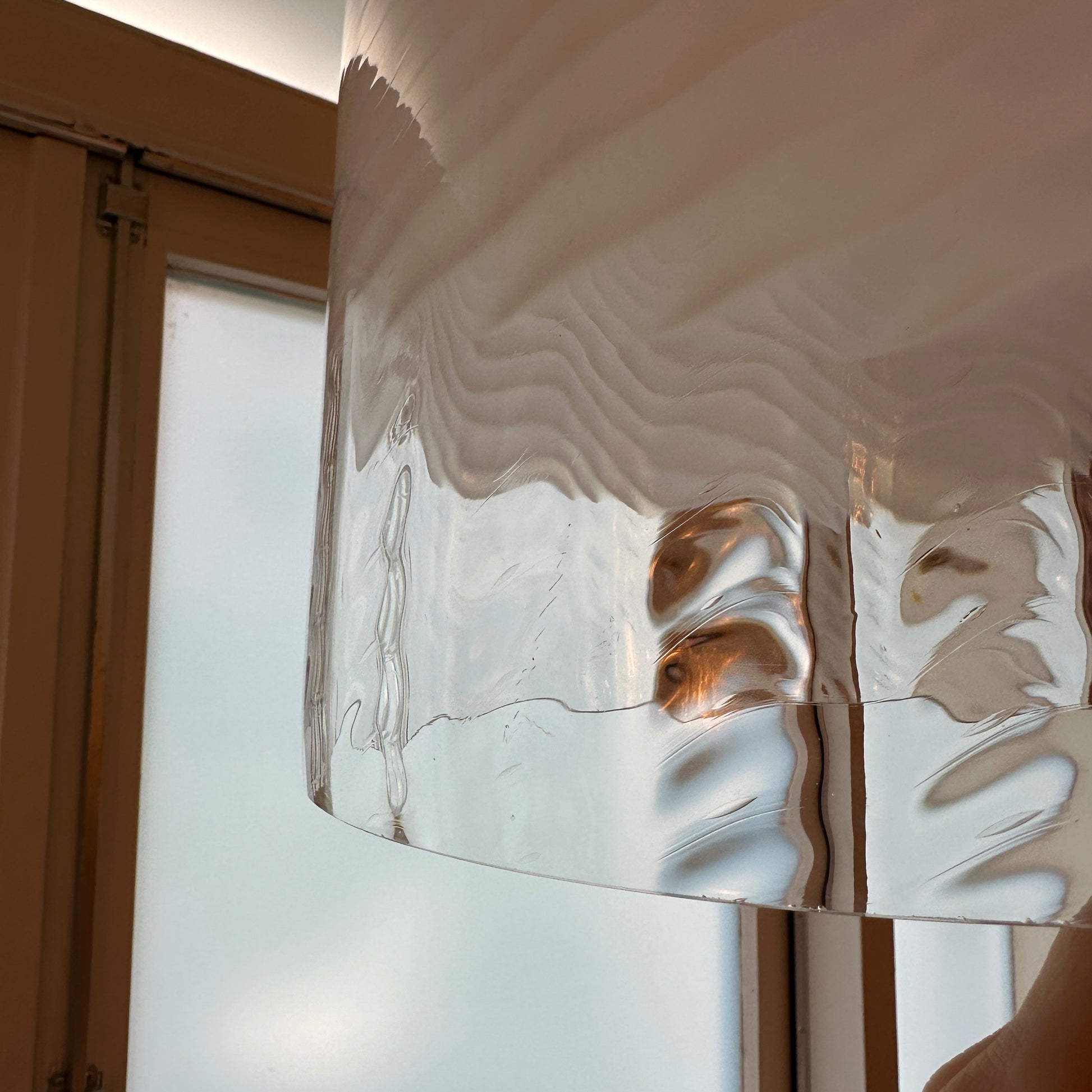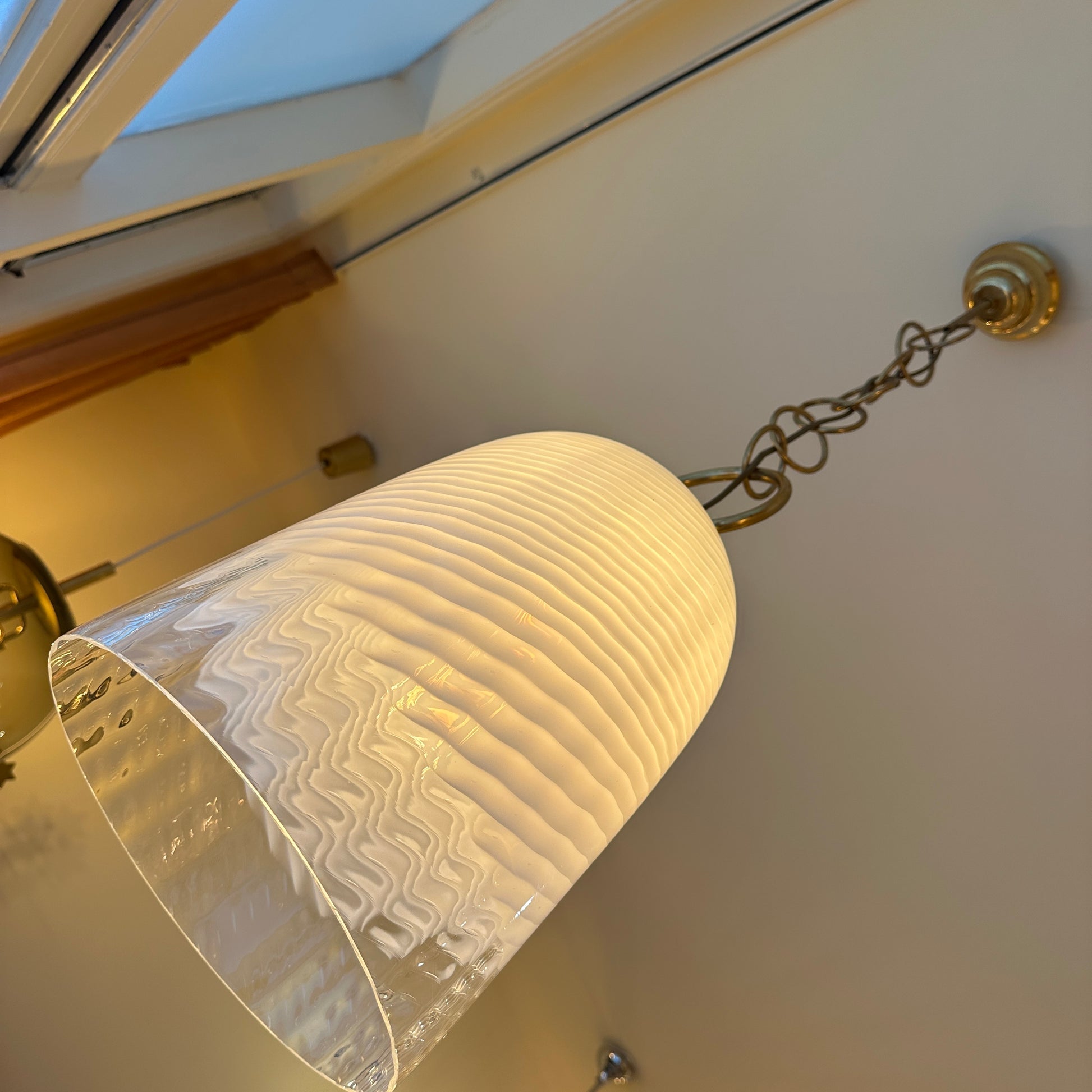Another vintage Italian beauty! This white opaline milk glass with swirls gives the right amount of chic with a funky twist to a space. This bell shaped glass pendant has a brass frame. Some very small, almost unnoticeable, signs of use at the bottom edge.