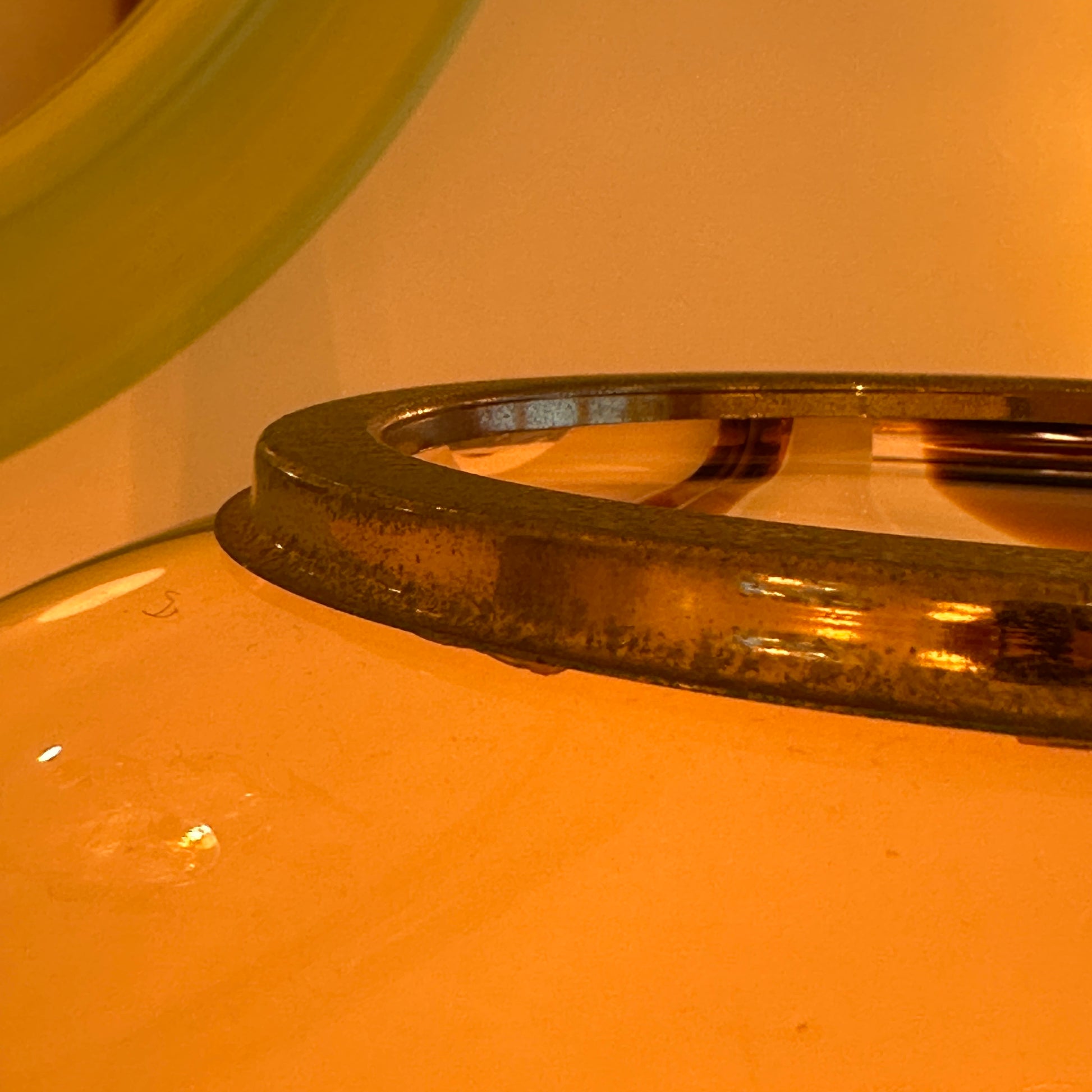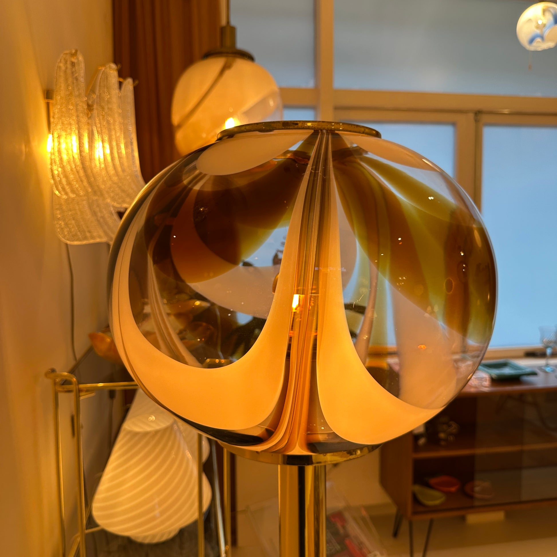 The glass shade is beautifully made with thick, high-quality Murano glass and a soft glossy finish. When lit, it creates a warm glow with those iconic swirling reflections on the wall. The brass ring on top can be taken off if desired.