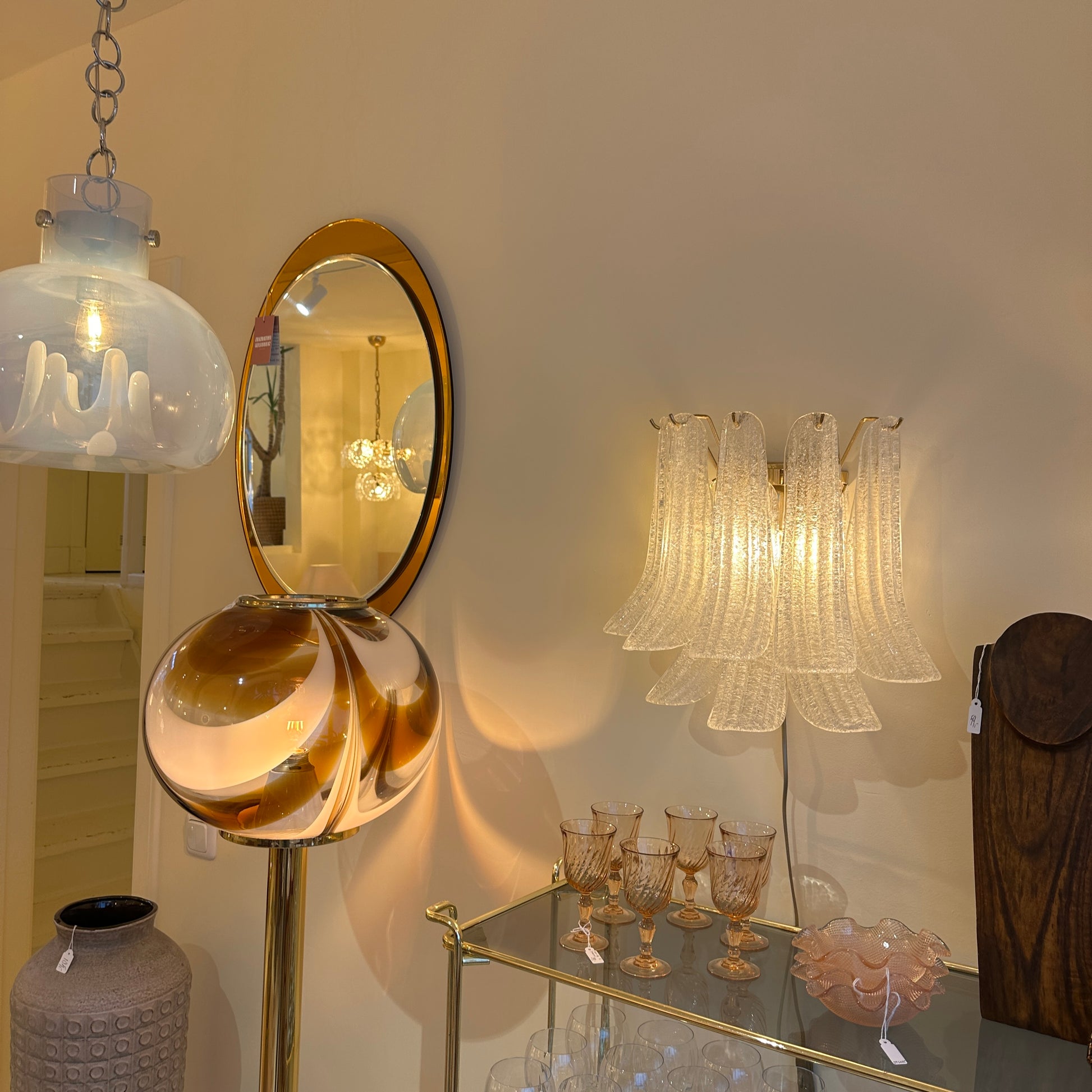 So happy with this stunning find! This 1960 Italian wall light, has eight clear Murano glass petals with an ice glass finish on the back. The petals are hanging on a gold metal / brass look frame.
