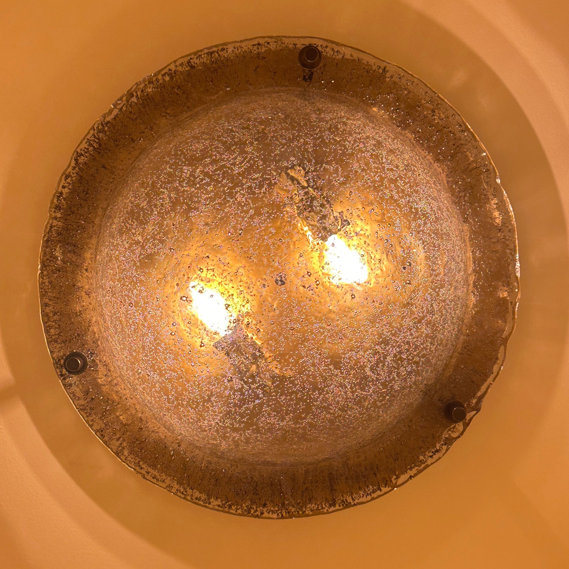 Round XL ceiling light made by Cosack Leuchten. The lamp is made of very thick (heavy) smoked ice glass, full of bubbles. The fixture is made from brushed brass. Diameter 50 cm with 2 E27 sockets