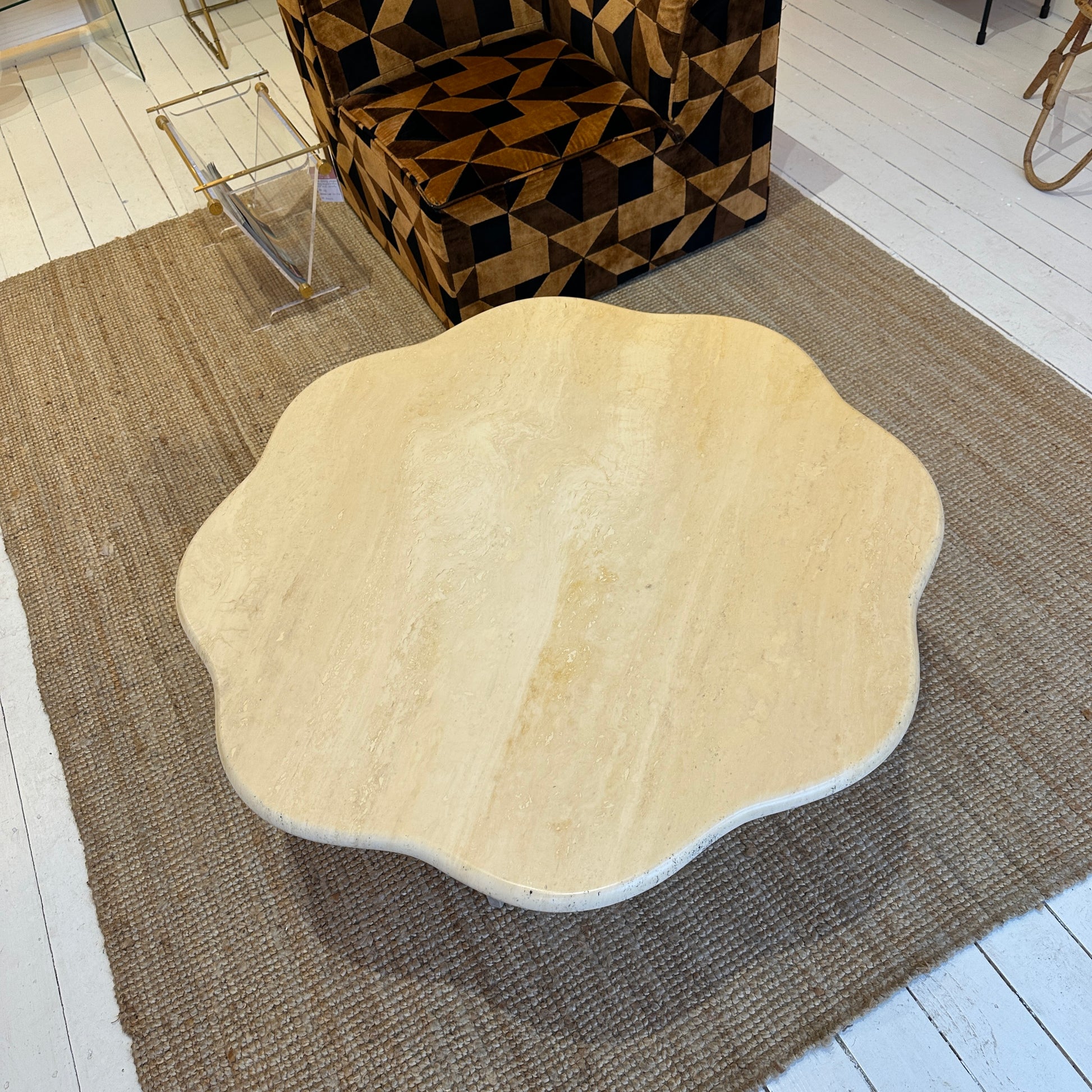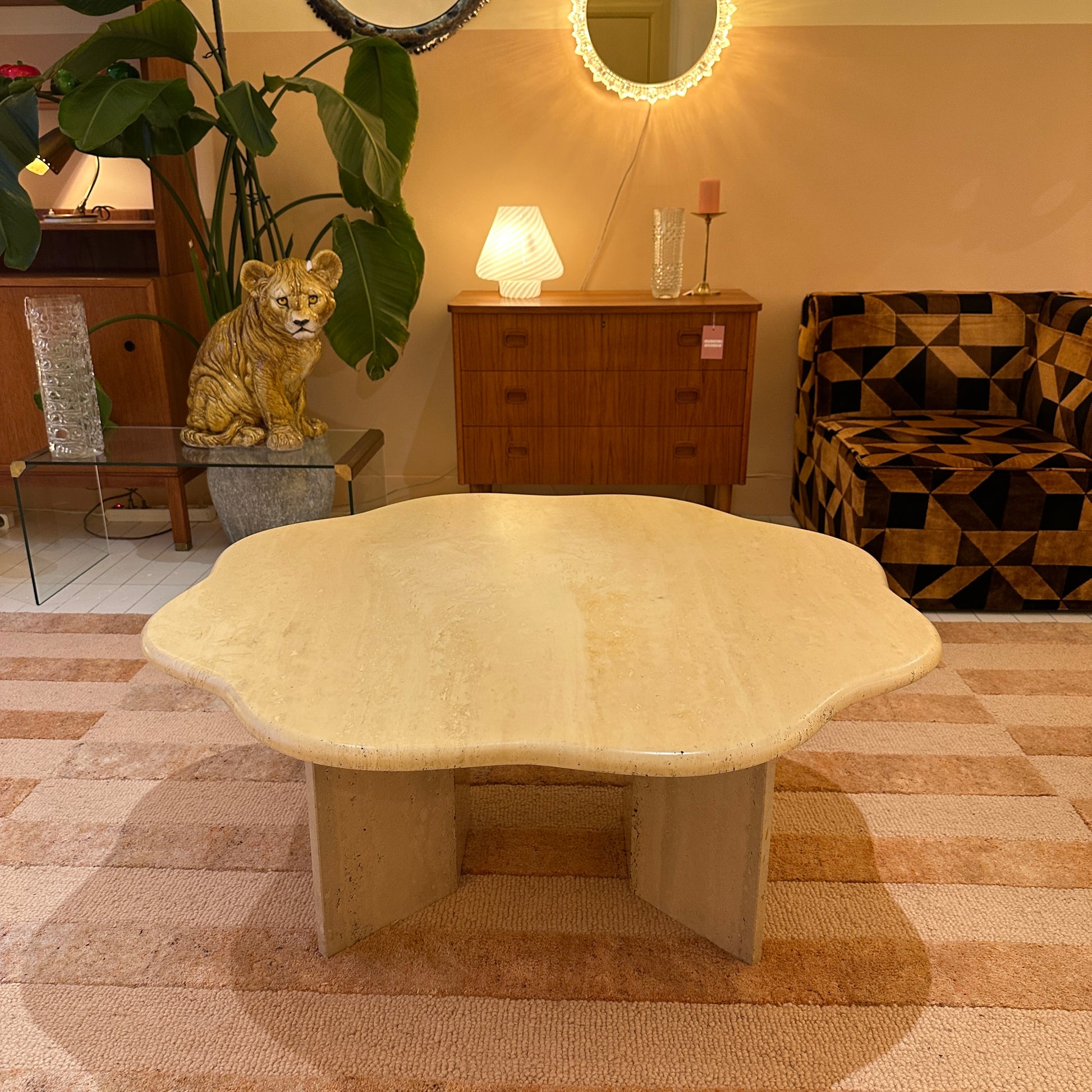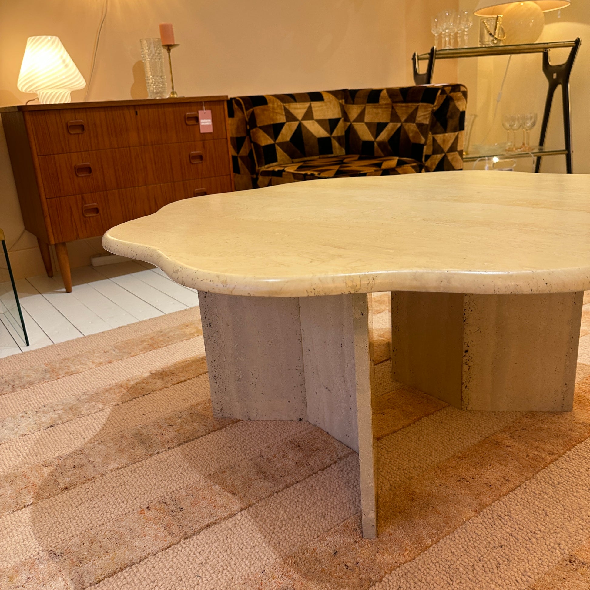 This sculptural travertine coffee table is truly unique. Whether you see a organic flower shape or a soft cloud-like form, it’s undeniably an eye-catcher. The warm travertine stone instantly brings us to Italy in the 1970s, with subtle Hollywood Regency influences.